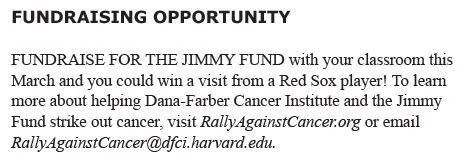 FUNDRAISE FOR THE JIMMY FUND with your classroom this March and you could win a visit from a Red Sox player! To learn more about helping Dana-Farber Cancer Institute and the Jimmy Fund strike out cancer, visit RallyAgainstCancer.org or email RallyAgainstCancer@dfci.harvard.edu.