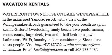WATERFRONT TOWNHOUSE ON LAKE WINNIPESAUKEE in the manicured Samoset resort, with a view of the Winnipesaukee Broads guaranteed to take your breath away, in scenic Gilford! Overlooking sandy beach. Two pools, marina, tennis courts, large deck, two-and-a-half bedrooms, two bathrooms, Wi-Fi, laundry and air conditioning. Sleeps five to six people. Visit http://LEASUL0.wixsite.com/waterfront-townhouse. Email LeaSull@aol.com or call 508.733.5482.