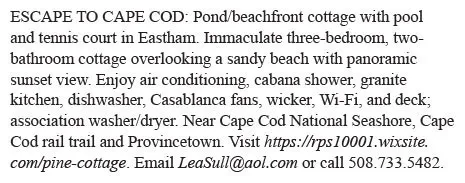 ESCAPE TO CAPE COD: Pond/beachfront cottage with pool and tennis court in Eastham. Immaculate three-bedroom, twobathroom cottage overlooking a sandy beach with panoramic sunset view. Enjoy air conditioning, cabana shower, granite kitchen, dishwasher, Casablanca fans, wicker, Wi-Fi, and deck; association washer/dryer. Near Cape Cod National Seashore, Cape Cod rail trail and Provincetown. Visit https://rps10001.wixsite.com/pine-cottage. Email LeaSull@aol.com or call 508.733.5482.
