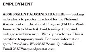 ASSESSMENT ADMINISTRATORS — Seeking individuals to proctor in school for the National Assessment of Educational Progress (NAEP). Work January 24 to March 4. Paid training, time, and mileage reimbursement. Weekly paychecks. This is part-time temporary work. For more information, go to http://www.WorkNAEP.com. Questions? Email NAEPrecruit@westat.com.