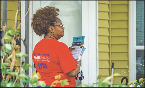 Tracey Pratt, a 22-year educator, is among the MTA canvassers who have been visiting homes in Somerville this summer. Pratt, who teaches health and is a member of the Cambridge Education Association, said that passing the ballot question will make the tax system fairer for everyone.