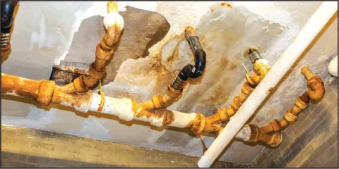 Lead and asbestos particulate are present in the building, EAW Health and Safety Committee members say, and water damage is visible on the walls and ceilings in several rooms.