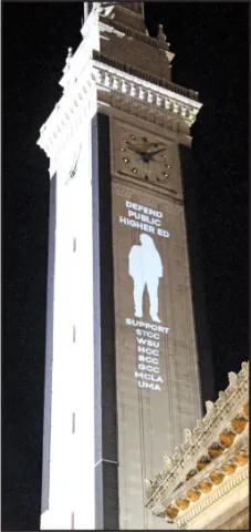 Several campus demonstrations in the fall led to a coordinated statewide action with the arts-activist group The Illuminator. The group worked with MTA members in November, visiting community college and university campuses as well as key locations in downtown Springfield and Boston. During their travels, the activists projected pro-education messages on numerous buildings.
