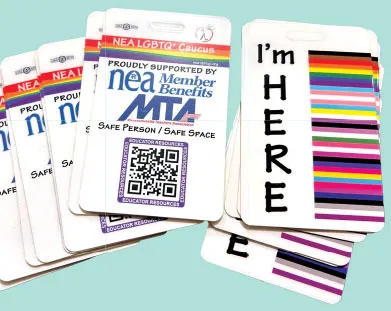 The MTA LGBTQ+ Committee recently ordered "I’m here" badges that educators can wear on their lanyards to show support for LGBTQ+ students and staff and demonstrate that they’re a safe person to speak to.