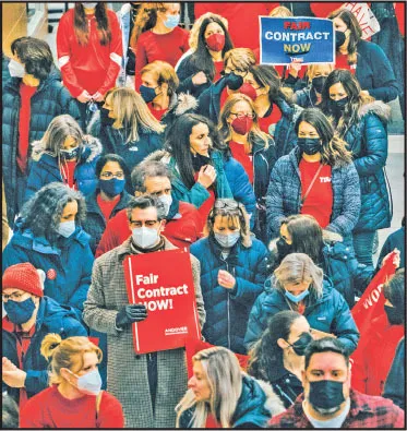 Educators who belong to the Tewksbury Teachers Association have been trying to negotiate a new contract since early 2021. In recent months, they have participated in a series of actions to demand fairness, with support from fellow union members in other locals. On Feb. 10, more than 200 TTA members and allies packed a School Committee meeting. Above, members raised their hands as they sought to speak. At right, educators stood up to make their position clear. Amid educators’ efforts to be heard, officials ordered the room cleared.