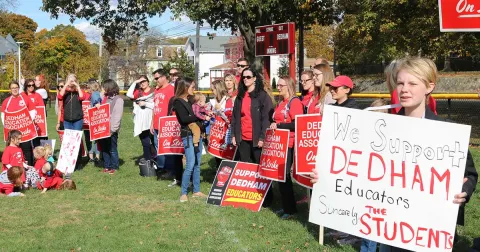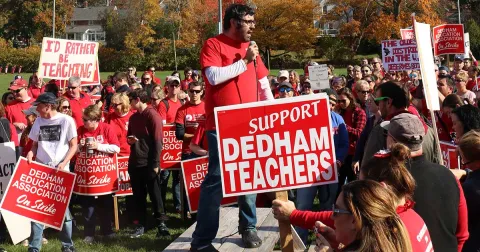 Statewide union leaders, educators from other districts, parents and children joined Dedham educators shortly before noon on a town field across the street from the teachers’ de-facto strike headquarters at the American Legion Hall on Eastern Avenue. From there, the crowd marched in a lively display of solidarity to another field near the town’s middle school.