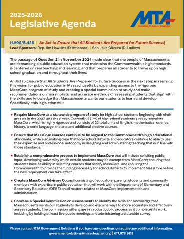 An Act to Ensure that All Students Are Prepared for Future Success is the next step in realizing this vision for public education in Massachusetts by expanding access to the rigorous MassCore program of study and creating a special commission to study and make recommendations on more holistic and accurate methods of assessing students that align with the skills and knowledge that Massachusetts wants our students to learn and develop. Specifically, this legislation will:.